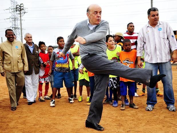Político em época de eleição faz qualquer coisa para aparecer. Vejam aqui José Serra, candidato à prefeitura de São Paulo, pagando o maior mico. Em visita ao clube escola Délio de Carvalho, na zona leste da capital paulista, ele fez promessas, andou pelo campo de terra e, atendendo a pedidos, resolveu bater um penalti. No entanto, o sapato saiu voando no momento do chute e foi parar atrás do goleiro. "Eu senti que o sapato ia sair antes de bater na bola" - disse Serra em meio a muitas risadas. É a nossa Foto do Dia.